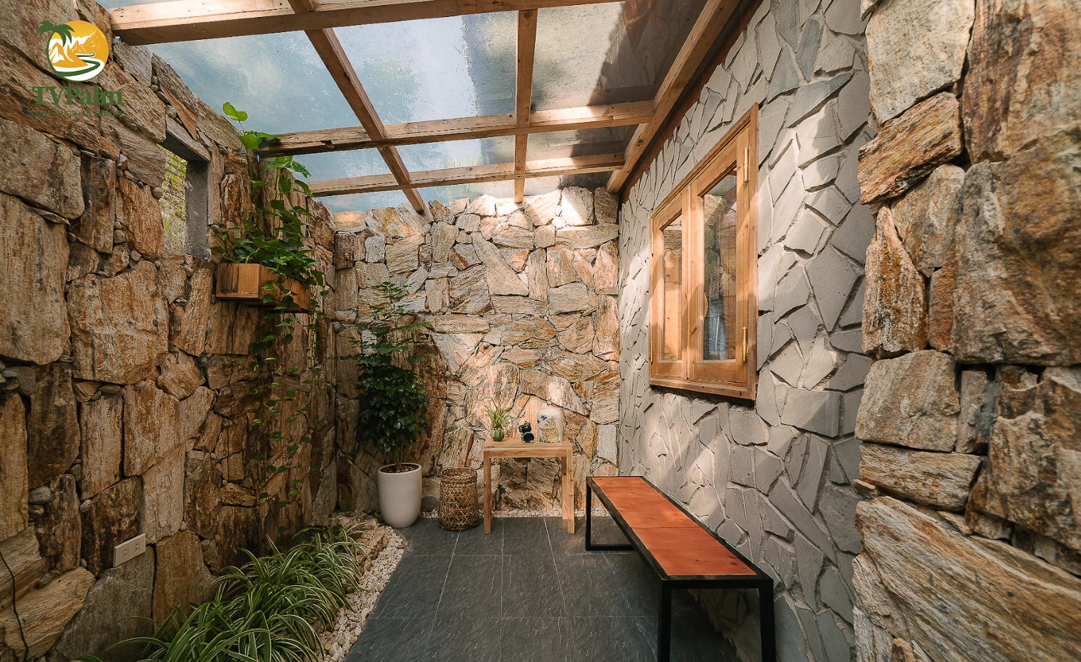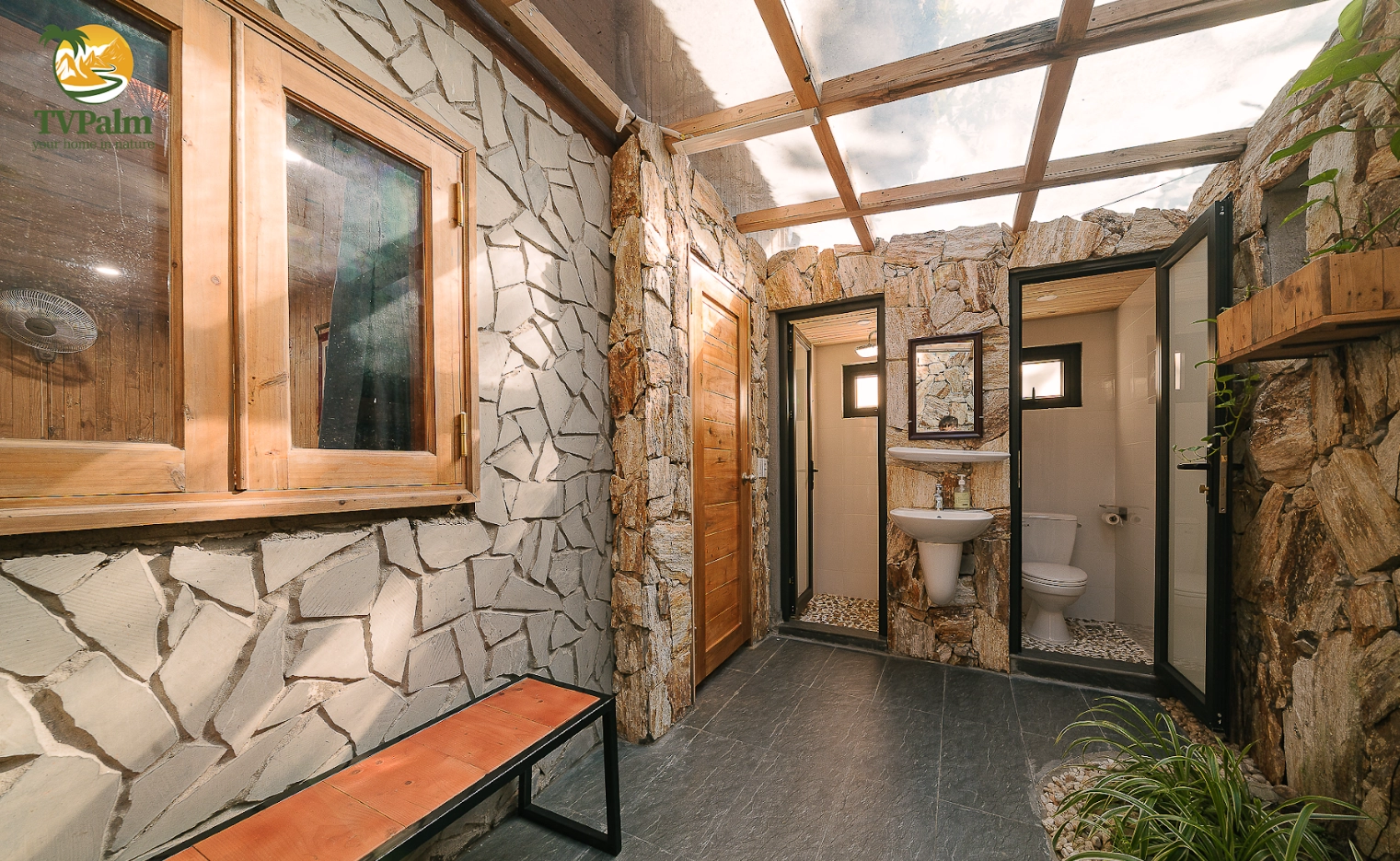 The family room at TVPalm Ecolodge offers a uniquely designed private space, featuring a separate bathroom and toilet. This area is complemented by an outdoor play area that embraces nature, highlighted by wooden, stone, and plant elements that promise to provide relaxation during your stay.